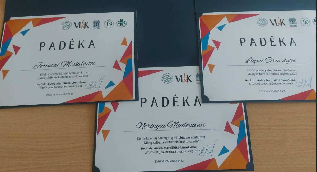 Mūsų gimnazijos mokiniai ir šiais metais aktyviai įsitraukė į respublikinį kūrybinį konkursą „Mūsų kalbinis kultūrinis kraštovaizdis“, kurį organizavo Lituanistų sambūris kartu su Valstybine lietuvių kalbos komisija, Lietuvių literatūros ir tautosakos institutu, Lietuvių kalbos institutu bei Lietuvių kalbos draugija. Konkursas skatina mokinių domėjimąsi gimtąja kalba, kultūra ir kūrybine saviraiška. Šiais metais konkurso organizatoriai sulaukė apie 200 mokinių kūrybinių darbų. Padėkas už dalyvavimą konkurse gavo penktokė Jorinta Meškelaitė ir IV klasės mokinė Liepa Gruzdytė.
