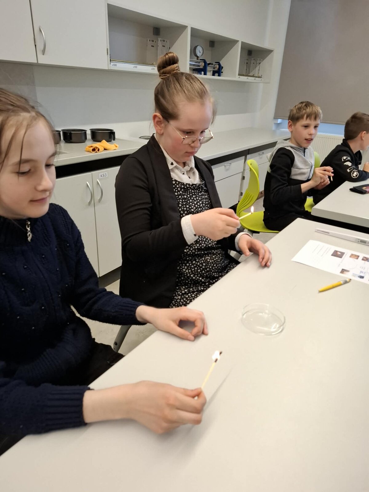 Kitoje edukacijoje – „Medžiagų būsenų kitimai, negrįžtami medžiagų kitimai“ – mokiniai atliko įvairius eksperimentus, stebėjo, kaip kinta medžiagų būsenos, aiškinosi skirtumus tarp grįžtamų ir negrįžtamų procesų. Jie turėjo galimybę patys tyrinėti, kelti hipotezes ir daryti išvadas.
