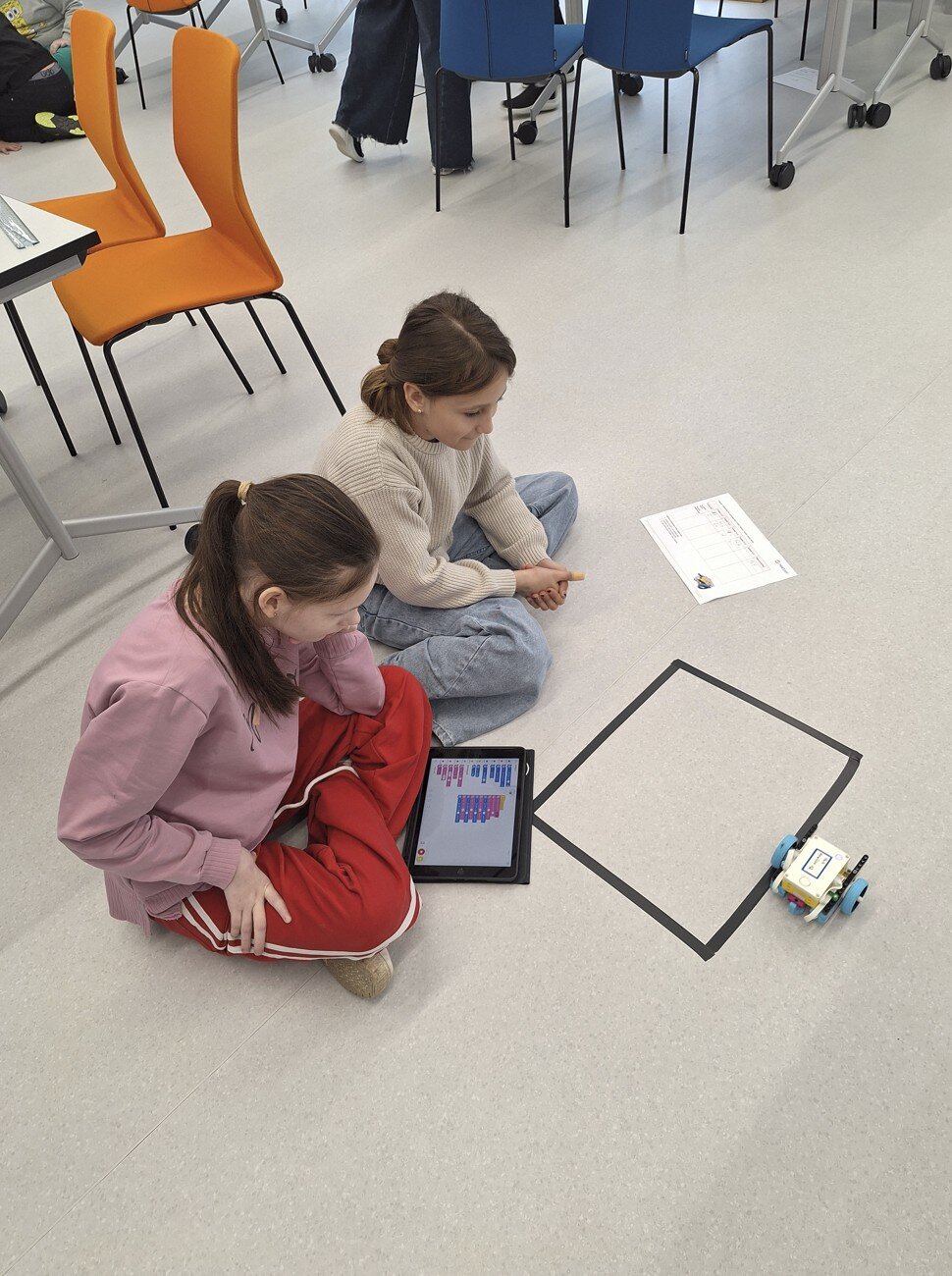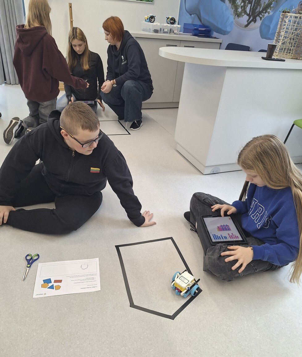 Kūrybiškumo netrūko ir vėliau – poromis mokiniai planavo geometrines figūras ir lipnia juosta jas kūrė ant grindų. Robotas, judėdamas figūros kraštinėmis, padėjo ne tik vizualiai suvokti geometrines sąvokas, bet ir tiksliai apskaičiuoti figūrų perimetrus. Kiekviena veikla baigdavosi pristatymais, diskusijomis ir bendru rezultatų aptarimu, skatinančiu pasitikėjimą savimi ir mokėjimą argumentuoti.
