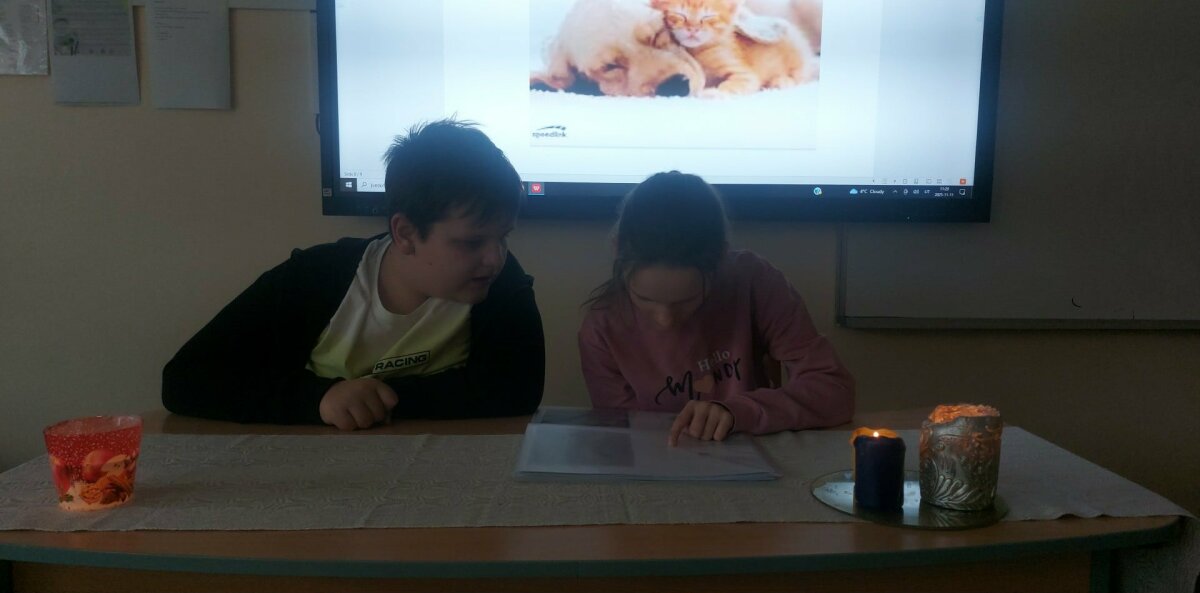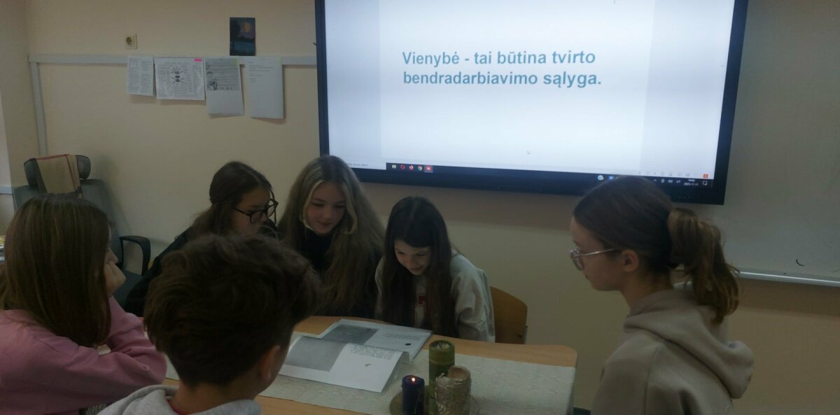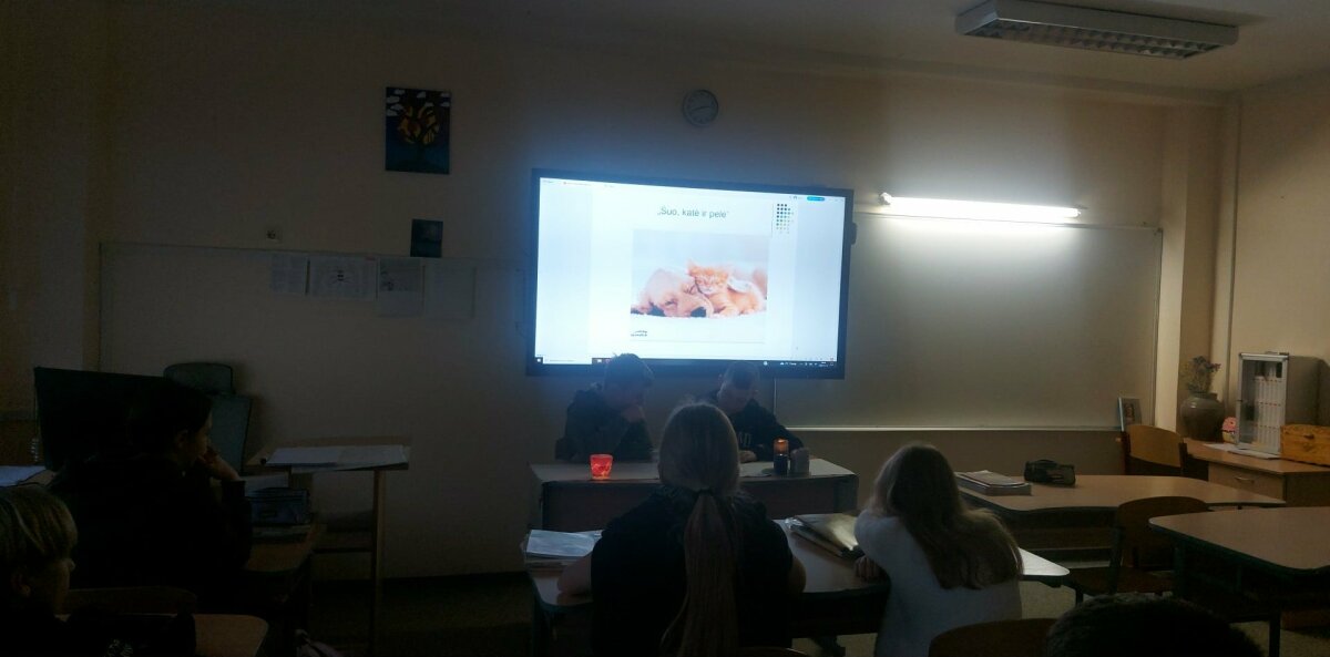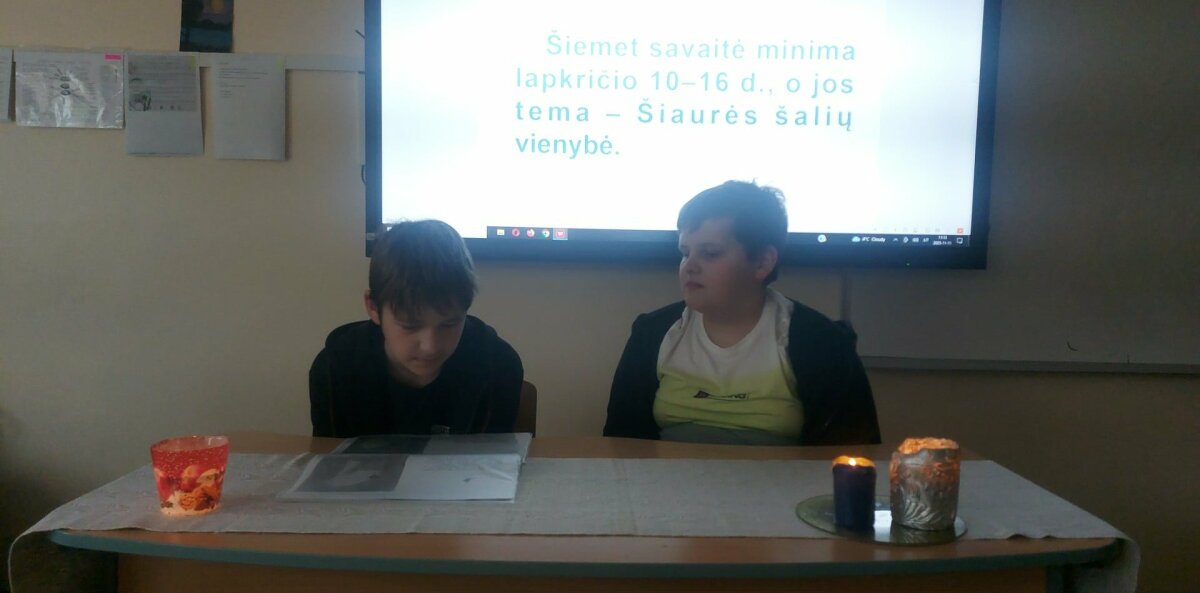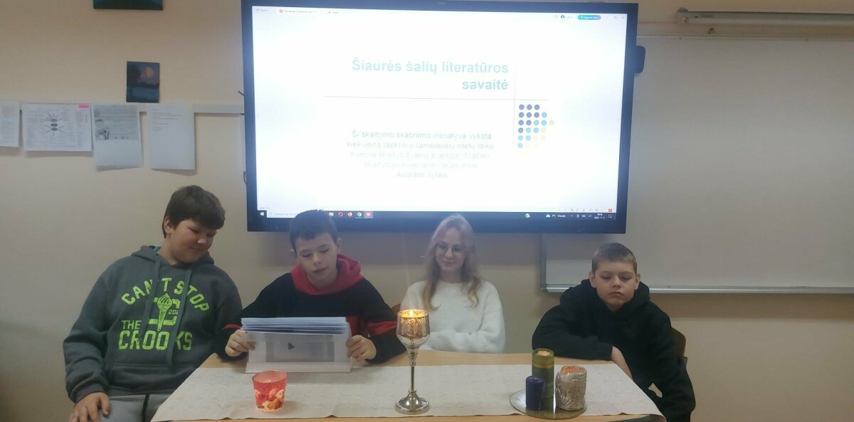 Lapkričio 11 d. penktokai, šeštokai ir septintokai dalyvavo Šiaurės šalių literatūros savaitės projekte. Šių metų tema „Šiurės šalių vienybė“. Tema pasirinkta atsižvelgiant į šių dienų iššūkius, su kuriais susiduria Šiaurės šalys ir visas pasaulis, ir unikalią Šiaurės šalių galimybę istoriškai ir kultūriškai tuos ryšius stiprinti dar labiau. Pamokų metu visi drauge žvakių šviesoje balsu skaitėme knygą „Šuo, katė ir pelė“, kurią sukūrė dailininkas ir rašytojas Bárðuras Oskarssonas iš Farerų salų. Knygoje susipažinome su šunimi, kate ir pele, kurie nusprendžia gyventi kartu. Kurį laiką jie gyvena taikiai ir darniai, kol visiems pasidaro nuobodu. Kad galėtų toliau gyventi kartu, jie turi kalbėtis apie savo problemas. Nepaisant skirtumų ir nesutarimų, jie supranta, kad iš tiesų gerai leidžia laiką, ir nori toliau gyventi drauge. Mokiniai pasidalijo savo mintimis apie išklausytą kūrinį, apie vienybės galią.