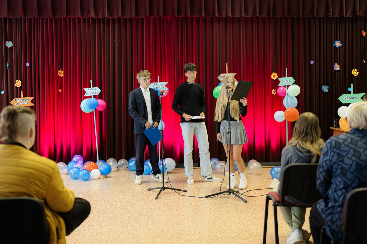 Šventės vedėjai, 2024-2025 mokslo metų traukinio palydovai, Miglė Volkovskytė ir Nojus Vilūnas kvietė visus leistis į simbolinę kelionę laiku, aplankyti svarbiausias stotis nuo rugsėjo iki birželio ir prisiminti šventės, renginius, kurie prisideda prie gimnazijos įvaizdžio stiprinimo. Kad kelionė būtų įsimintina ir nenuobodi, ją lydėjo penktokų ir Austėjos Garnevičiūtės jausmingai atliekamos dainos, jaunųjų kūrėjų Mijos ir Jurgilės skaitomos eilės, Gedimino Akinsko užburianti saksofono melodija.