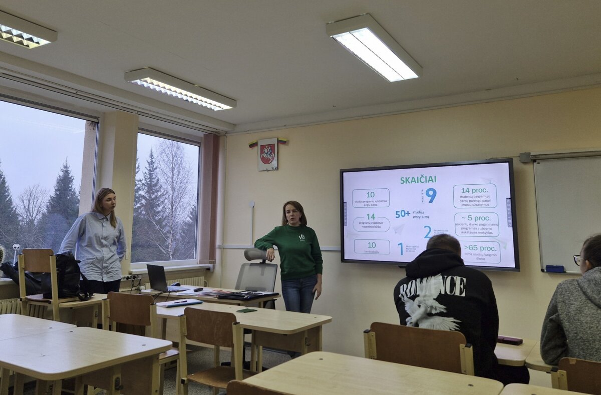 Gimnazijoje lapkričio 11 d. ir lapkričio 18 d. apsilankė svečiai iš dviejų aukštųjų mokyklų – Vilniaus universiteto studentės Gabrielė ir Dovilė bei Vilniaus kolegijos studentų priėmimo organizavimo vadovė Anželika Slimanavičienė. Vizito tikslas buvo pristatyti mums, abiturientams, šiuolaikines studijų galimybes, pasidalyti patirtimis bei paskatinti mus nebijoti aukštojo mokslo.